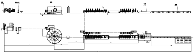 開卷→剪切對焊→螺旋活套→校平→軋制成型→高頻焊接→刮刀→冷卻 →定徑→矯直→飛鋸切料→下料臺