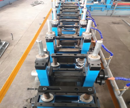 水平輥架為龍門式結(jié)構(gòu),其中:開口成型4機(jī)架;閉口成型3機(jī)架。水平輥模具采用隔套直接固定,保證機(jī)組精度 Horizontal rollerbracket is gantry structure, including: open molding4 brackets; Silent molding 3brackets. Horizontal rollermold adopt spacer fixed directly, ensure its accuracy |
